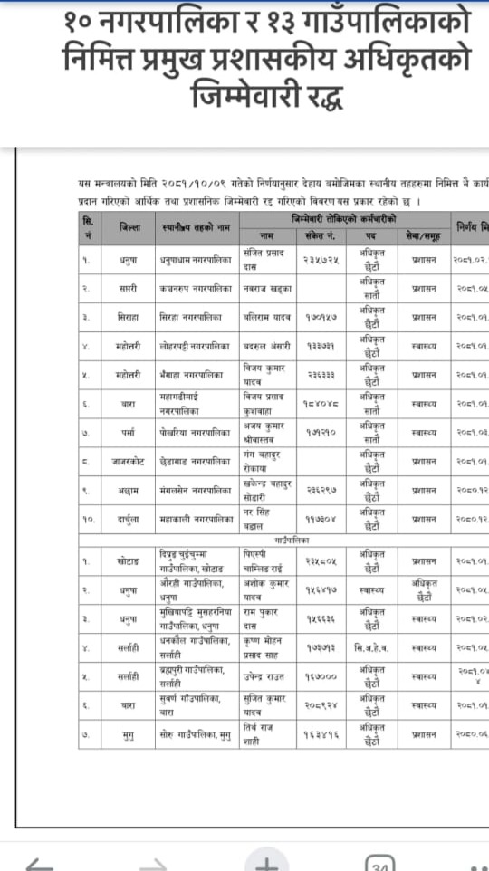 मन्त्रालयले बुधवार गरेकाे निर्णय अनुसार उक्त बमाेजिमका स्थानिय तहहरूमा निमित भइ आर्थिक तथा प्रशासनिक तर्फ कार्यरत अधिकृतहरूकाे जिम्मेवारी रद्ध गरेकाे छ।